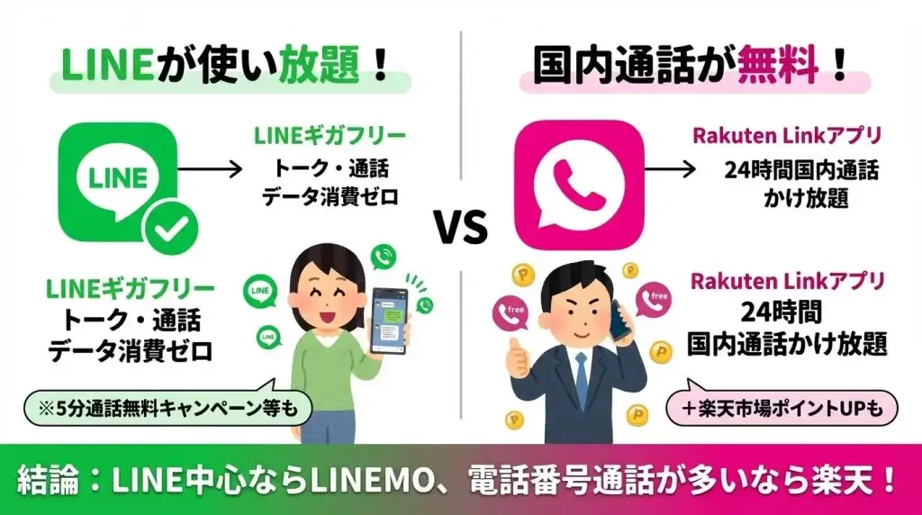 LINEMOと楽天モバイルを比較すると、「結局どっちがいいの?」と迷いますよね。