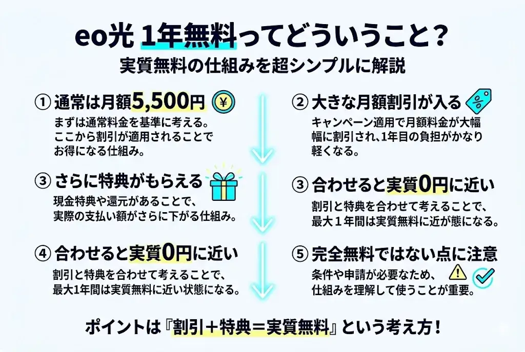 eo光 関西エリア限定で最大1年間、月額料金が実質無料という内容が気になっているなら、まずは全体像をサクッとつかむのが近道です。